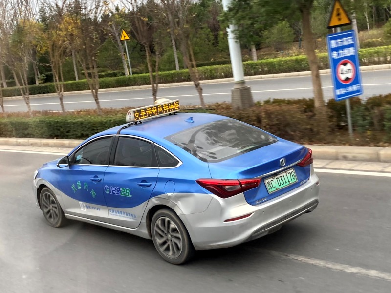このタクシーは、緑ナンバーの電気自動車です。