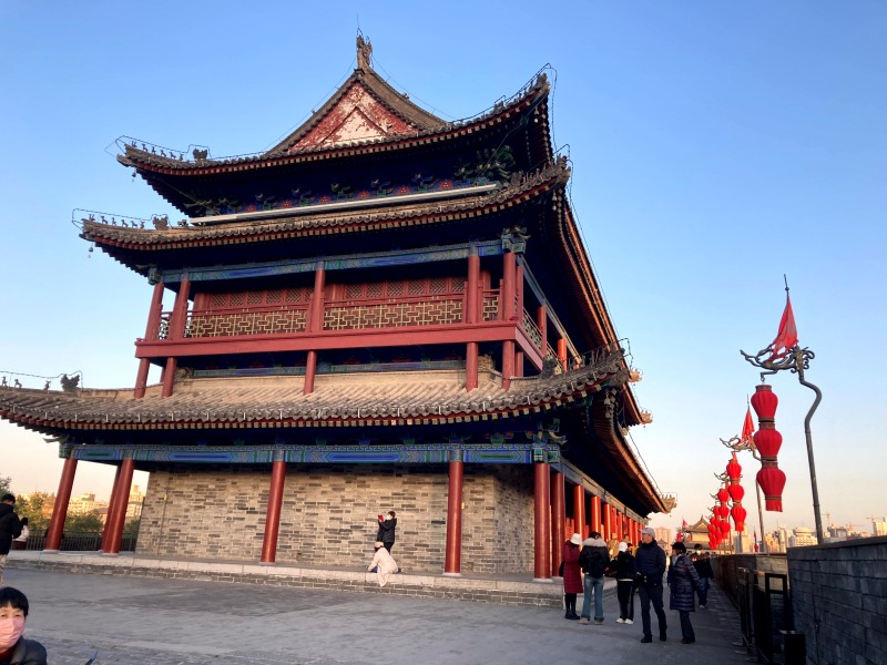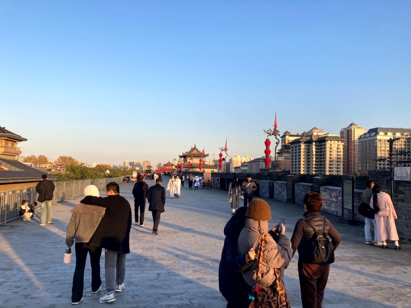 西安城壁の上からは、現代都市と歴史が交差する景色が一望できます。