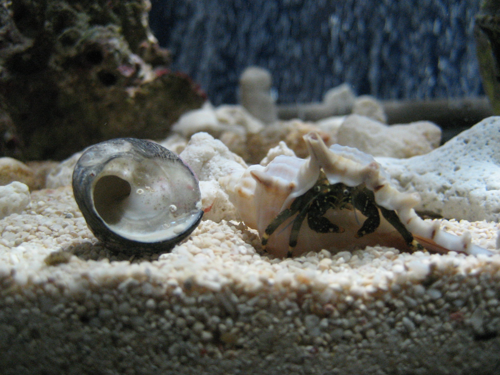 ヤドカリ君を見ているとどうも宿貝が窮屈そうで、新しい宿貝を探してるような動きをしている。