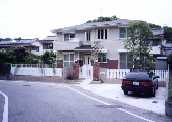 アプローチの奥に見えるのは、赤い花の咲く