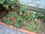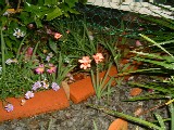 毎年ちゃんと顔を出す、都忘れ、ブラキカム、姫おうぎなど所狭しと咲き出しました。姫おうぎは花段を飛び越えて砂利のにも。
