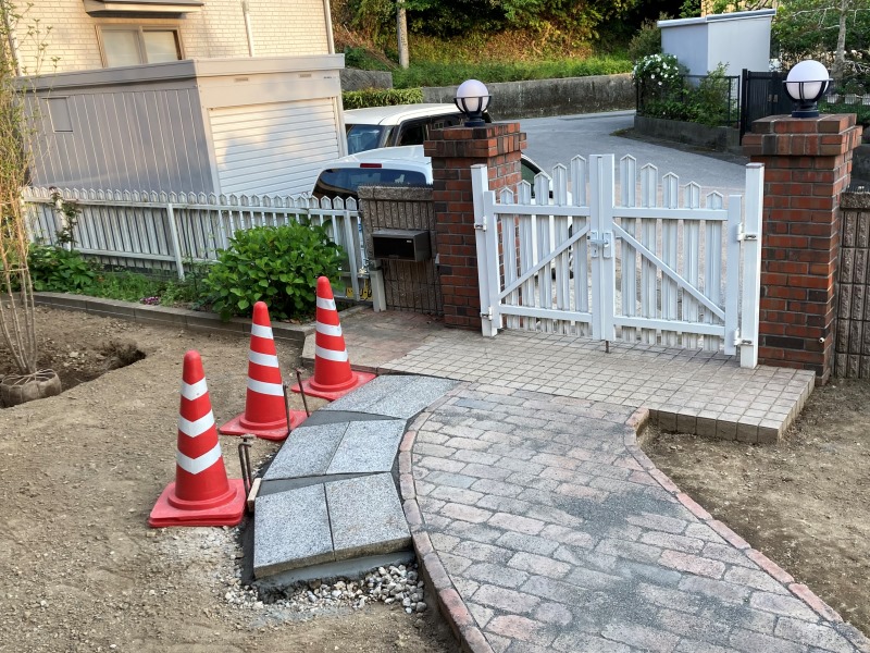 今まではアプローチと土面に段差がありレンガの角が削れて丸まっていたのです。