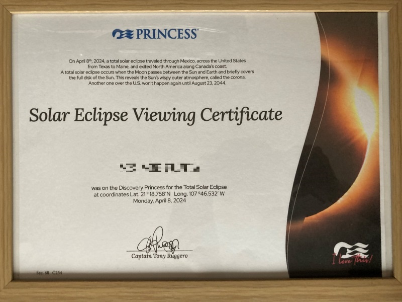 後日、サプライズでクルーズ船船長から乗客全員に個人名で「日食視聴証明書」が配られました。
