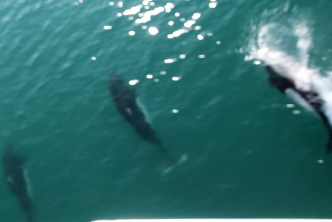 「イシイルカ」が船と並んで泳ぎジャンプしています。