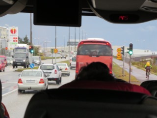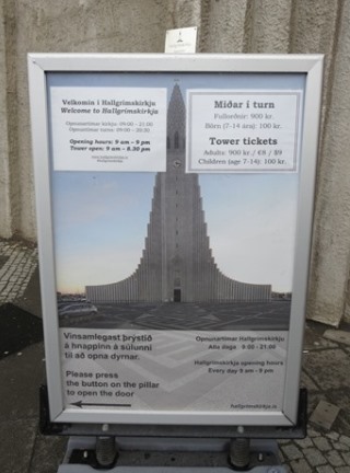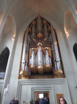 | 入口には、この教会の 開館時間や高さなどを紹介している。 入場は無料だ。 中は、至ってシンプルで 近代的な作り! 中に入って後ろを向くと この立派なパイプオルガンがある。 この教会には展望台があり エレベータで行くことが出来る。 有料で大人は、900クローナ やっぱり高い! |