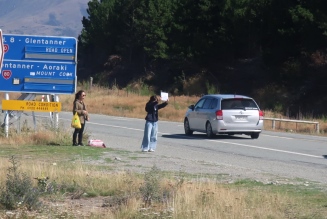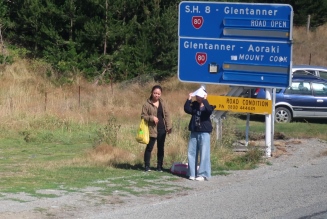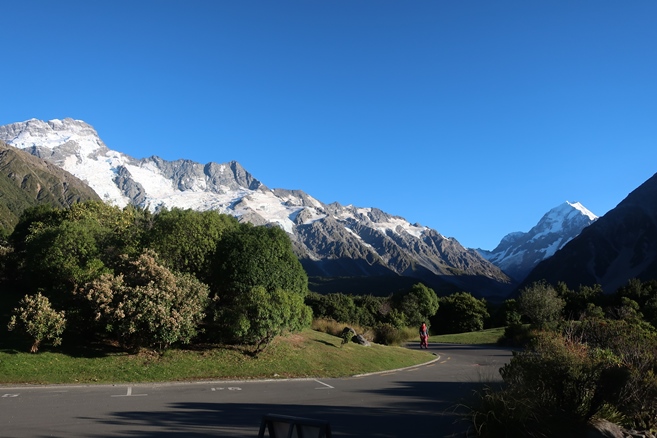目的地まで、あと少し! 良い撮影ポイントでマウント・クックをバックに“パチリ”!