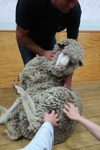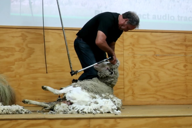 「毛刈りショー」の始まりです。機械で刈ると、あっという間に丸裸です。