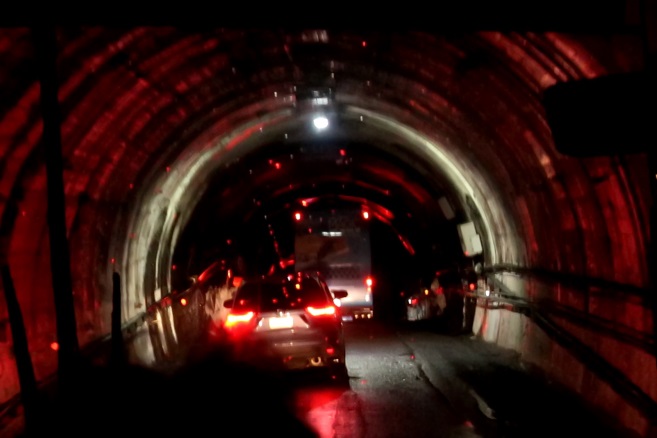 トンネルの中は、バスの場合中央を走らないと天井を擦ってしまうのだ。