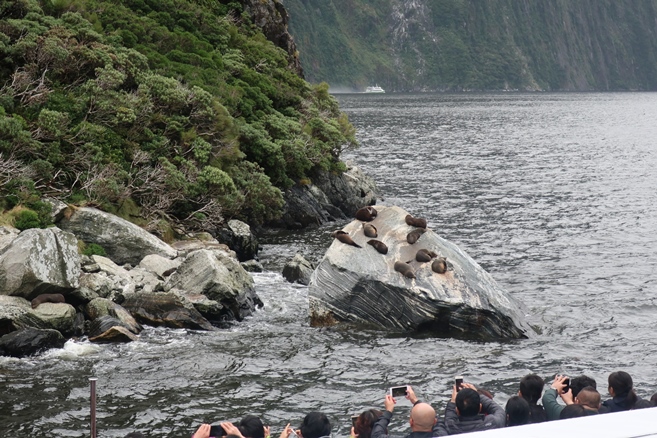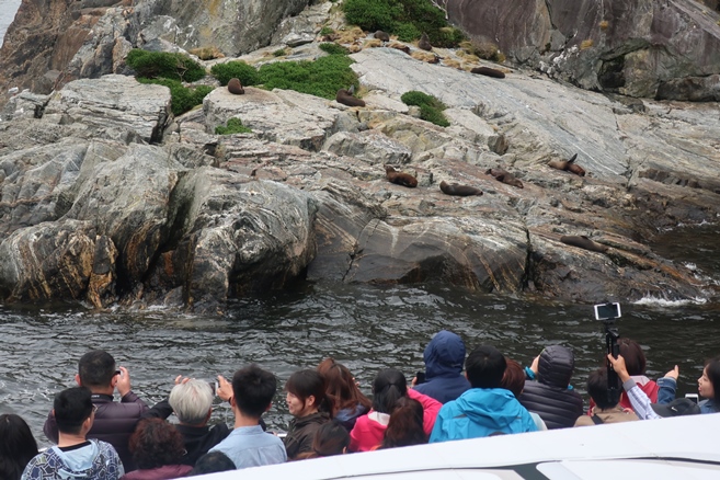 クルーズのコースなのか、オットセイや鳥がいる岩場まで大接近です。
