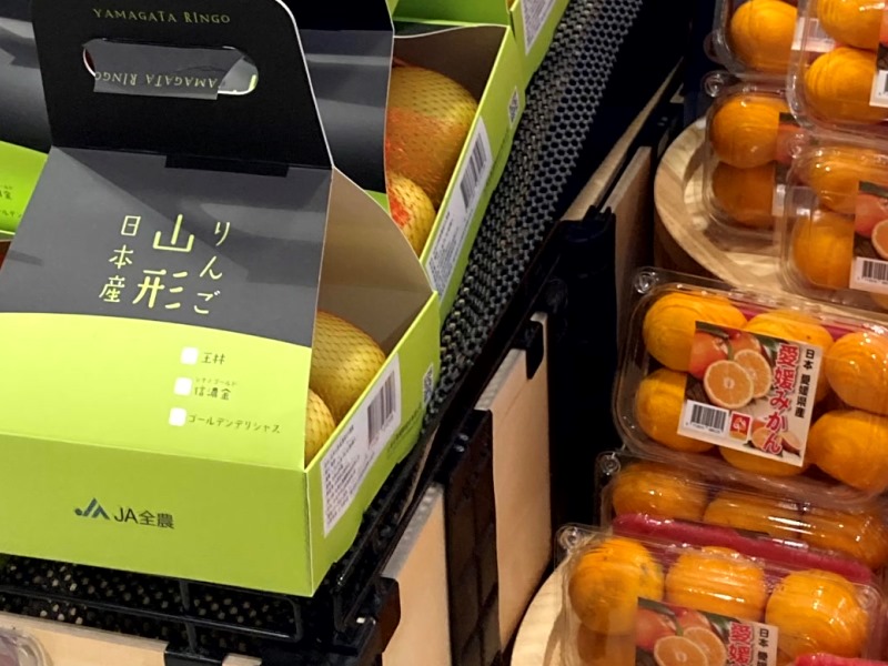 なんと、結構日本語で「りんご山形」や「愛媛みかん」の文字が!