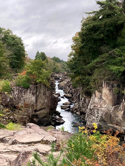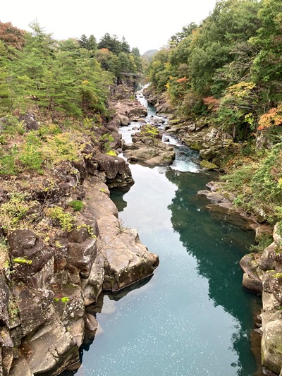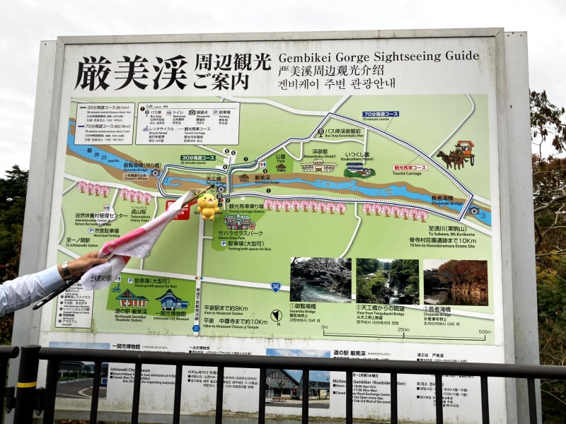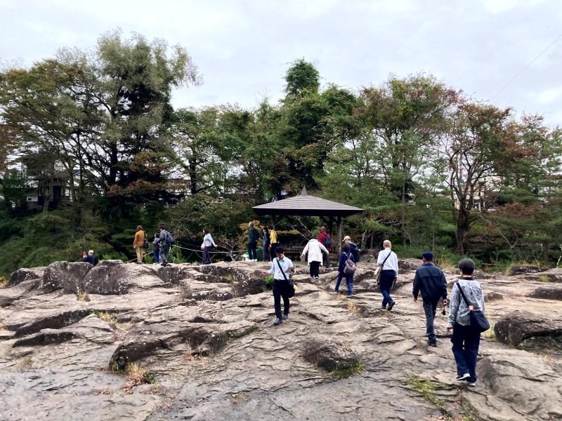 ツアー添乗員さんから厳美渓の見どころを説明してもらってます。