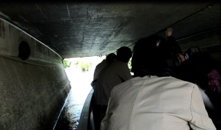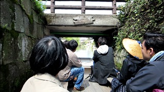 | 水路の途中には、このように狭く低い橋の下なども通りとてもおもしろい。 |