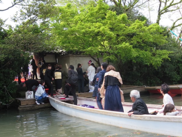 それは、三柱神社の赤い欄干橋のたもとの 「松月乗船場」 からの船出。
