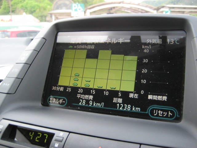 2009年4月26日 今回の距離数の内、約600kmは高速道路。結構良い燃費である。 今のタイヤ空気圧は4本全て2.5で十分期待に応えてくれる。 ただ、このタイヤは外気温度が低いと、以前のGT3のようには良い燃費は出ない感じ。