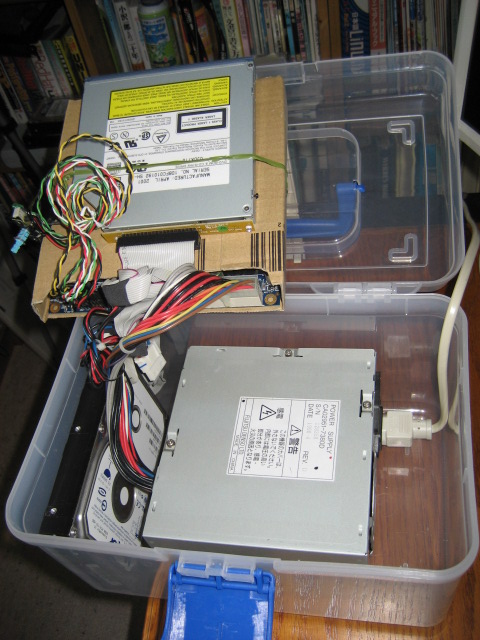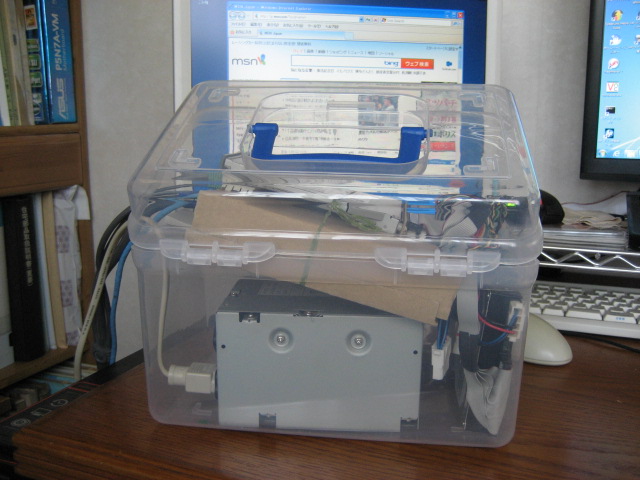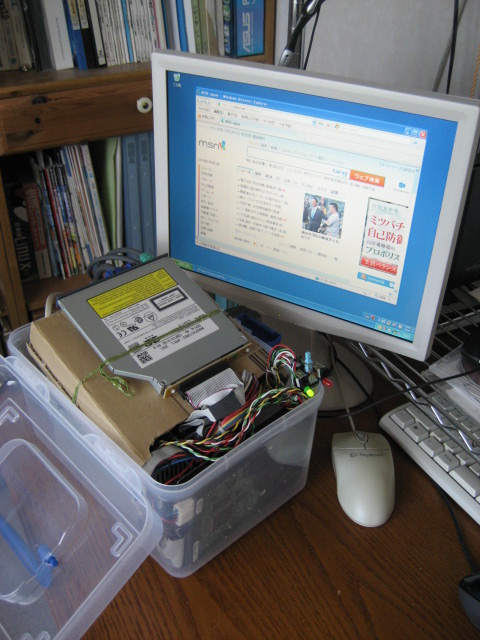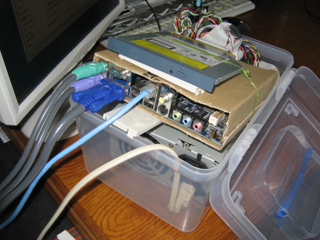 | (1) 電源は、通常のディスクトップPCの予備に置いていた電源! まあ、何と良い感じ! 適度な隙間があって換気もまあまあ。 (2) 三代目サーバーで使っていたマザーボードはファンレス設計! で、段ボールで包んでみた。ファンレスでなければ、こうは行かない。 使ってみても思ったより熱くならないのでこれでOK! DVDドライブも使えるぞ! ケースを切って蓋をしたまま使えるようにも考えたが 換気を考えて余計な細工はしないことにした。 (3) 電源スイッチもむき出し。 電源ランプ、HDDアクセスランプ、リセットスイッチ等もちゃんと使える。 (4) 換気に関して見ると 空気は、右上から入り左上に流れる。 隙間がちょうど良いかな? (5) 使わないときのこのおさまり具合! 我ながら思う、今回の携帯ディスクトップパソコンのもっとも優秀な部分です。 |