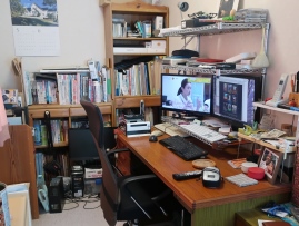 秘密のミニ書斎、お星さまドットコム工場! 23インチモニターと22インチテレビ兼モニター 奥には、テスト用の21.5インチのモニターが。 |