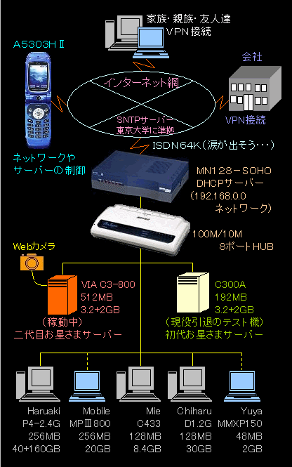 ・・・ 2005年4月頃まで ・・・ 我家の回線がとても貧弱なので画像をすこしコンパクトにしました。 詳細はマシンのページで紹介です。 以前から試行錯誤していた携帯電話や家族等のネットワークも機能アップしました。 回線がブロードバンドだったらもっと色々したいんだけどねえ・・・