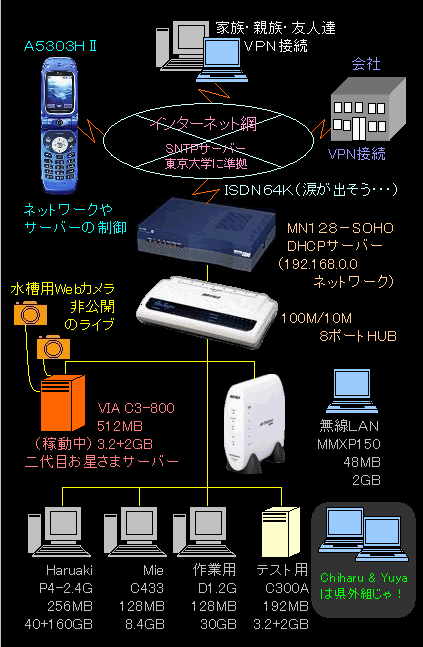 ・・・ 2005年11月頃まで ・・・ 今のところ、あまり使うことがないですが無線LANの環境も出来ています。 二代目サーバーには負担がかかりますがプライベートなライブ中継を楽しんでいます。 今年中には光ネットワークの環境が揃いそう・・・ 64K⇒100M(100000K)・・・1562.5倍のスピード! (T_T) から ⇒ \(^o^)/ へ